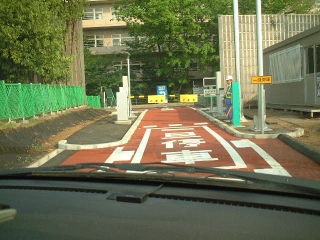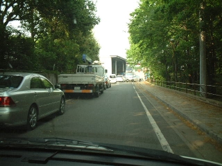 病院脇の狭い道、駐車車両もいっぱい
