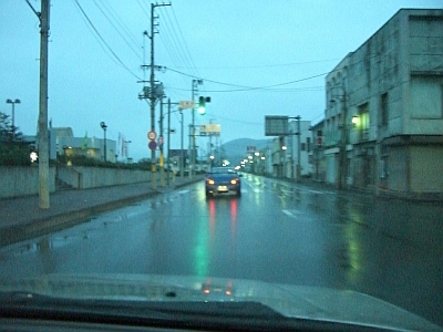 雨の足寄市街、前を行くのは札幌ナンバーのインプレッサ