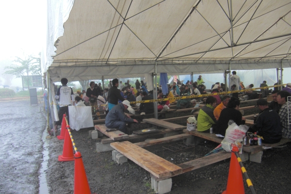 バーベキューコーナーで、みなさん雨宿り中