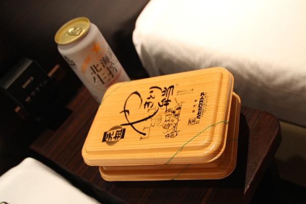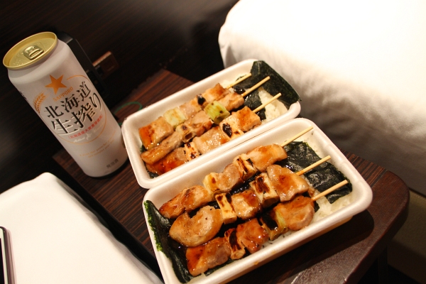 やきとり弁当と、北海道生搾りで、